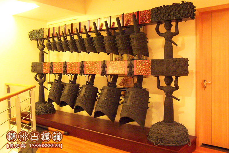 簡介:特制16件曾侯乙青銅編鐘,是隨州古編鐘公司根據(jù)客戶要求,按曾侯乙編鐘設(shè)計(jì)制作,編鐘為青銅鑄造,采用國際標(biāo)準(zhǔn)樂音音高A=440Hz調(diào)音,可以演奏古今中外樂曲,編鐘大梁采用優(yōu)質(zhì)松木制作,表面噴漆,彩繪花紋。