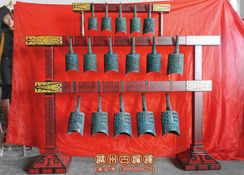 16件套系編鐘規(guī)格:長2米×寬0.4米×高1.8米,編鐘為青銅鑄造而成,表面顏色為古銅綠色,編鐘音域3個(gè)八度,從低音5至高音5,最大口徑25厘米,最小9.5厘米。